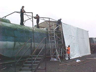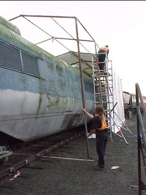 The two Steve's and Richard working on securing the frame and protecting the corners from rubbing the cover.