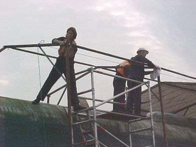 Members of the team working on the support ropes within the tent frame.